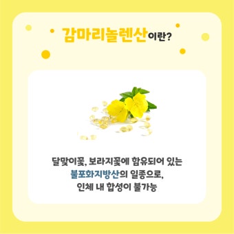 감마 리놀렌산(γ-Linolenic Acid, GLA)은 필수 지방산의 일종으로, 특히 오메가-6 계열에 속하는 불포화 지방산입니다. 인체가 스스로 충분히 합성하지 못하기 때문에 식품이나 영양제로 보충이 필요합니다. GLA는 주로 달맞이꽃 종자유, 보라지유, 블랙커런트 씨앗유 등 식물성 기름에서 발견되며, 우리 몸에서 프로스타글란딘이라는 생리활성 물질로 전환되어 다양한 생리작용을 돕습니다. 특히 염증 완화, 피부 보습, 호르몬 균형 등에 중요한 역할을 하며, 현대인들이 자주 겪는 만성 피로, 피부 트러블, 여성 건강 문제 개선에 도움을 줄 수 있는 성분으로 주목받고 있습니다.