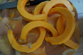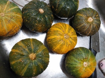 - 단호박을 찐 뒤 껍질을 벗기고 으깬다.