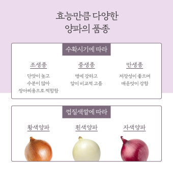 - 적양파(보라양파): 안토시아닌이 풍부하여 항산화 효과가 뛰어나며, 색감이 예뻐 샐러드나 피클로 많이 쓰입니다.